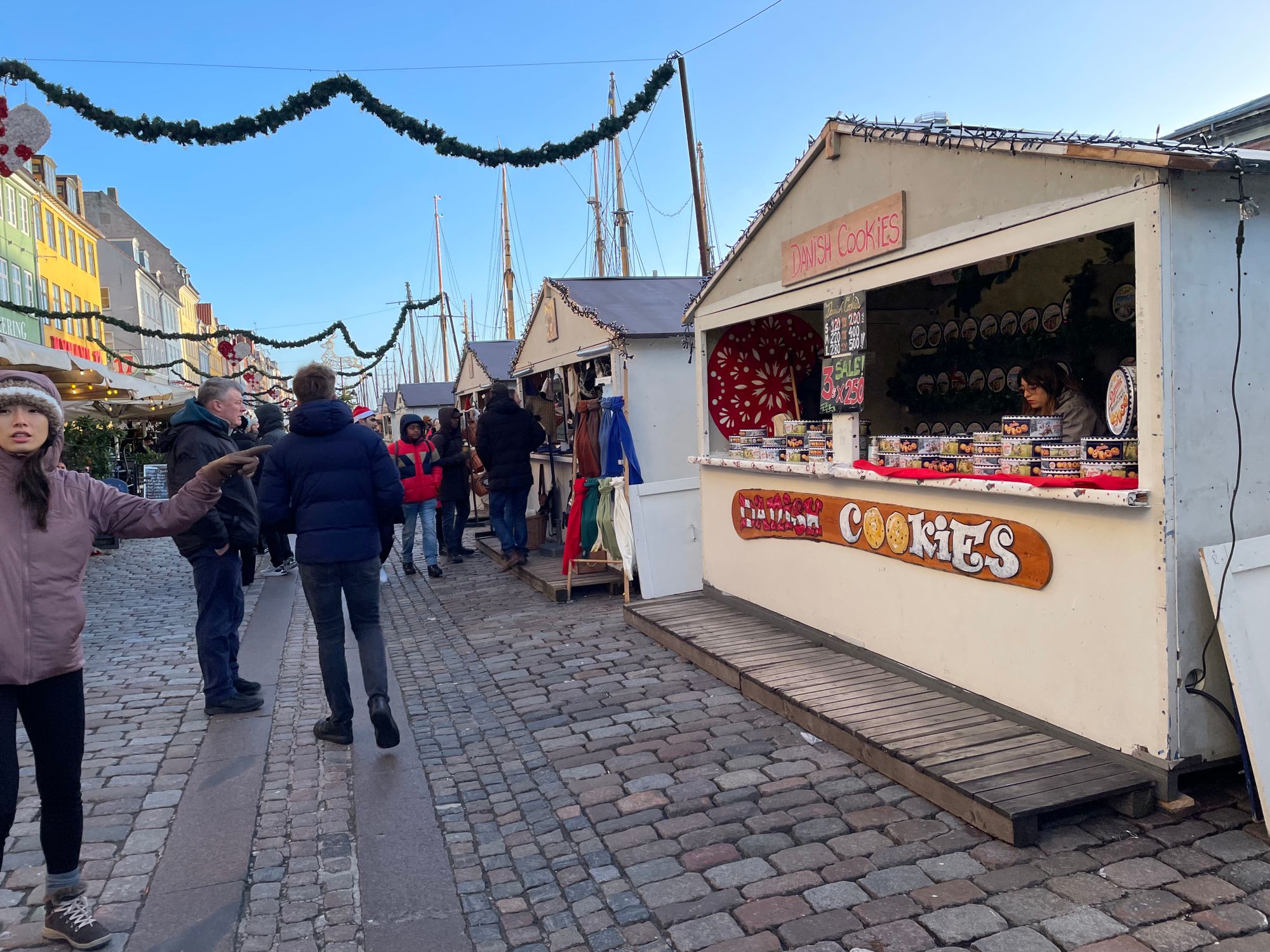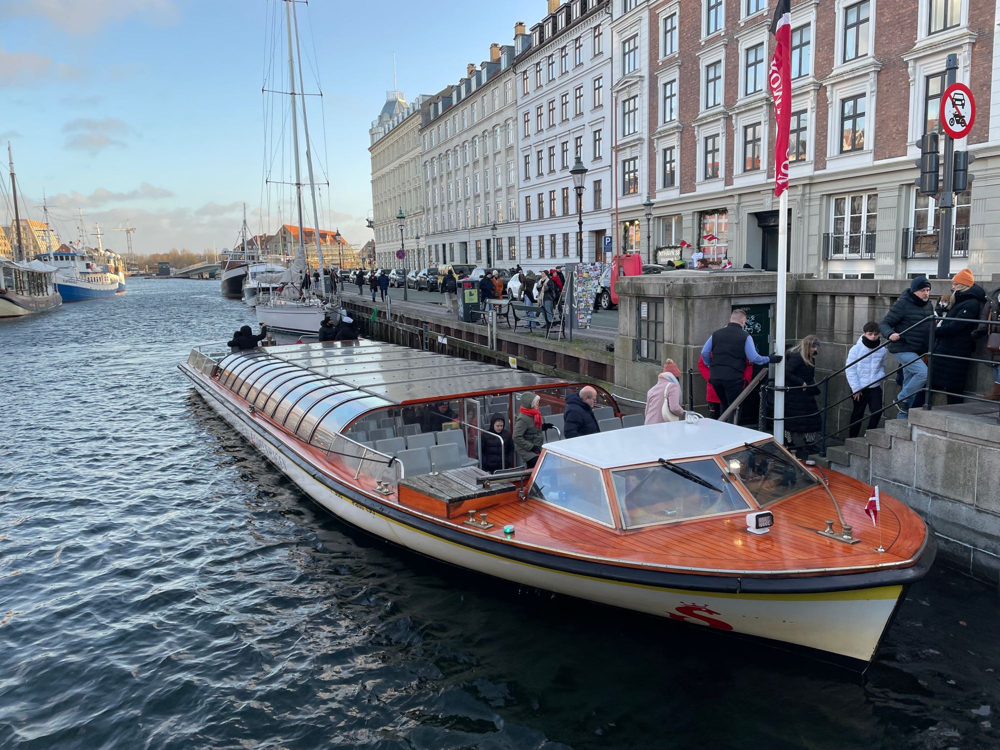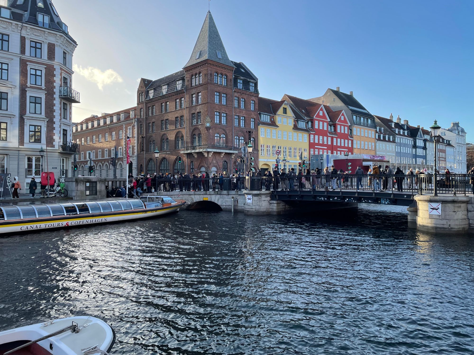 After a relaxing family day celebrating Christmas on Christmas Eve, it was time to have some breakfast and then spend Christmas Day exploring Copenhagen. The rain had moved away, and clear skies were thankfully apparent. We walked to the metro station and took the metro into the centre where we headed to Nyhavn. Nyhavn is a popular and well-known 17th century waterfront, canal, and entertainment area in the centre of Copenhagen. It is probably best known, and frequently photographed, due to its brightly coloured 17th and 18th century townhouses, cafes, and restaurants that line the beautifully boat fringed waterways. The area was constructed by King Christian V from 1670 to 1675. The area used to be a busy commercial port where ships docked from all over the world.
