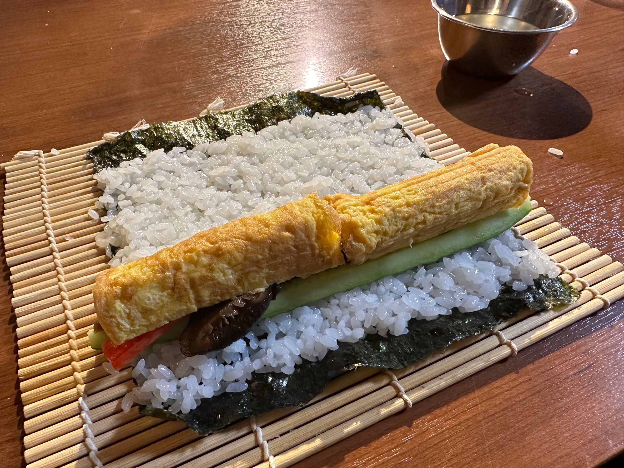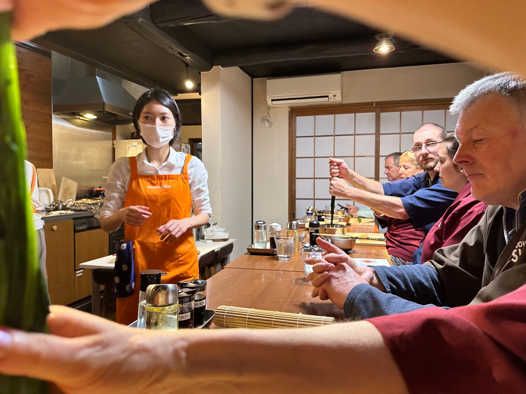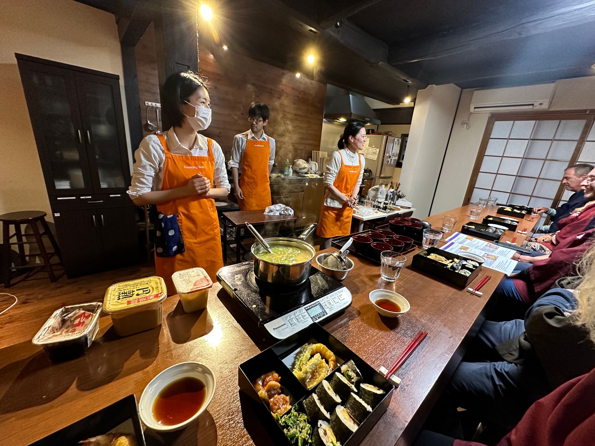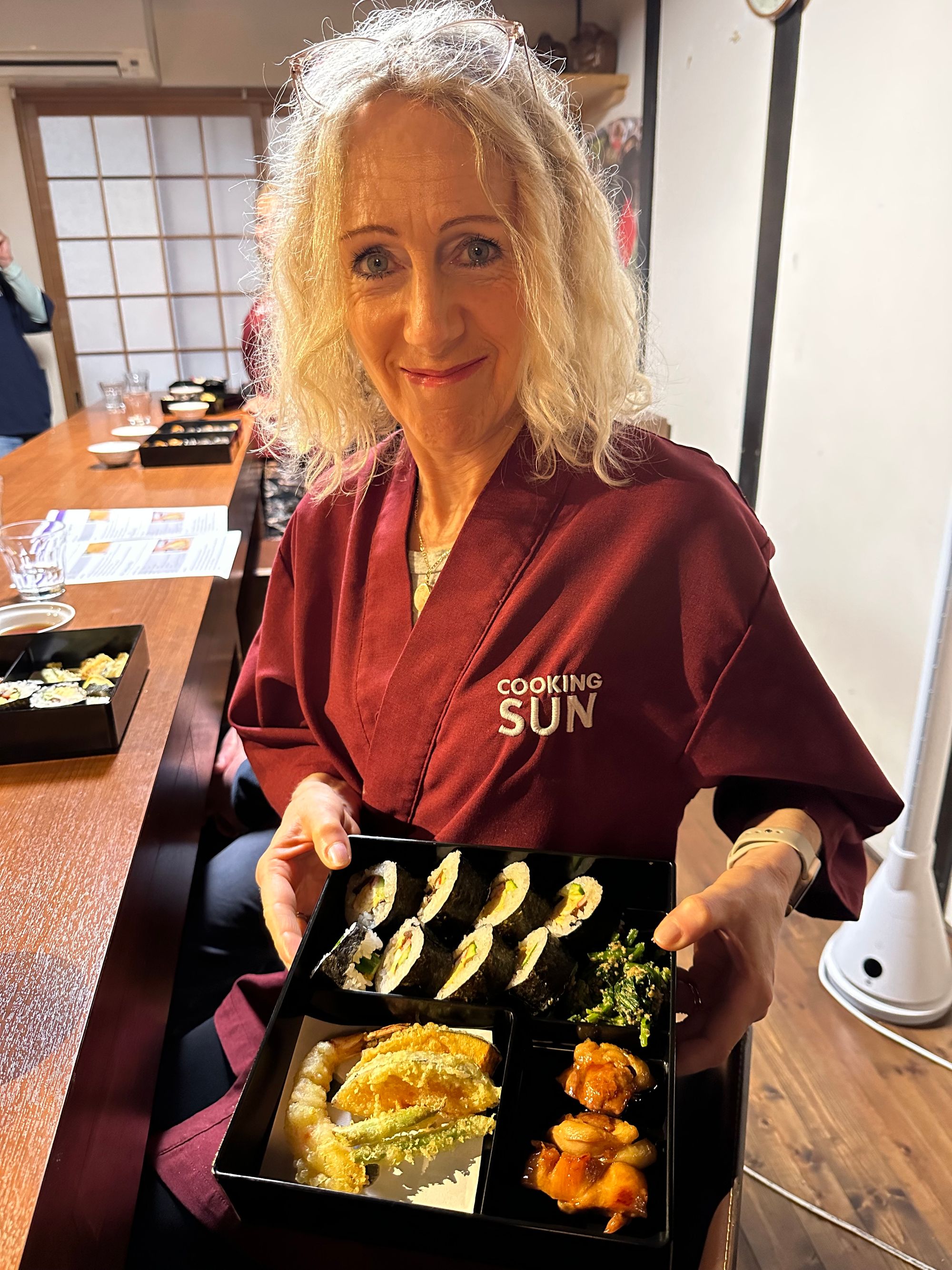 My next day in Kyoto was exciting and certainly different, as it involved a cooking class and a traditional Japanese tea ceremony. So, it was quite an early start and a fair walk to the Cooking Sun food school which is in an old machiya townhouse in central Kyoto. The school offers travellers the opportunity to cook and taste traditional Japanese cuisine. The class began at 9.30 am and ended at 12.30 pm. All the staff were friendly, and fluent in English, luckily, as I hadn’t managed to learn more than one or two Japanese words before my arrival – all my planned learning did not materialise! There were ten of us in total from different countries, including the USA and France, taking part in the cooking class. We had to put on a smart cooking overall each first before embarking on our cooking adventure. We were then all given a bento box to display our cooked delights in. I must mention that it was like a monsoon outside that morning, and everyone arrived a little wet to say the least. Anyway, we managed to produce a satisfying bento box that included Teriyaki chicken, tempura prawns and vegetables, and sushi rolls. This was our lunch, too, and it was extremely filling so I don’t think many people, including myself, managed to eat everything we had cooked!