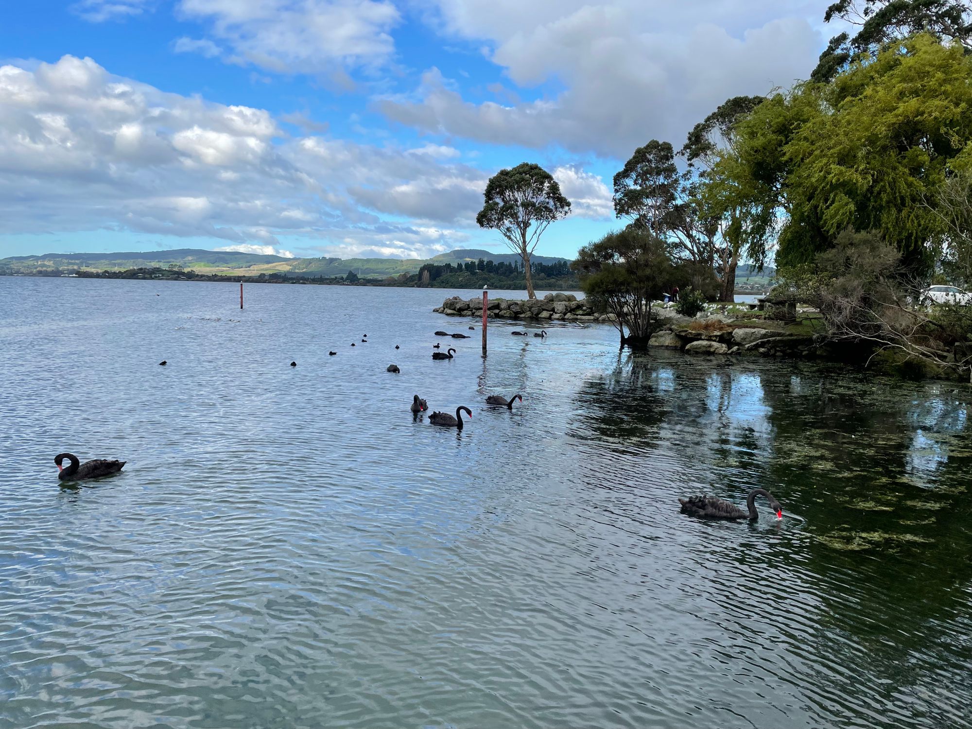 On the way back from the day’s adventures, we stopped off at Lake Rotorua which is the largest of the region’s lakes and is formed from the crater of a large volcano. This was beautiful and there were lots of birds here, including a number of black swans – a real haven for bird lovers.