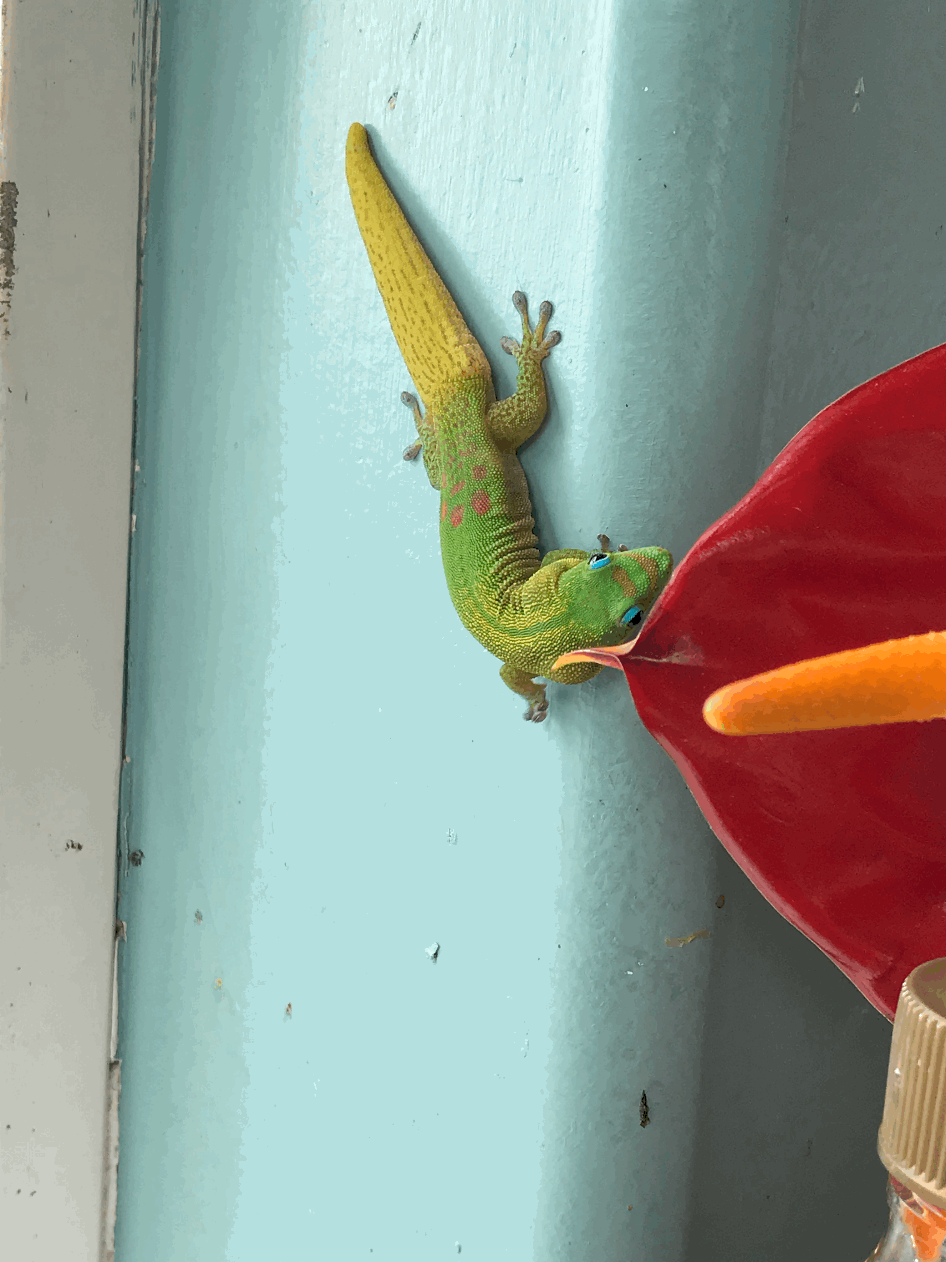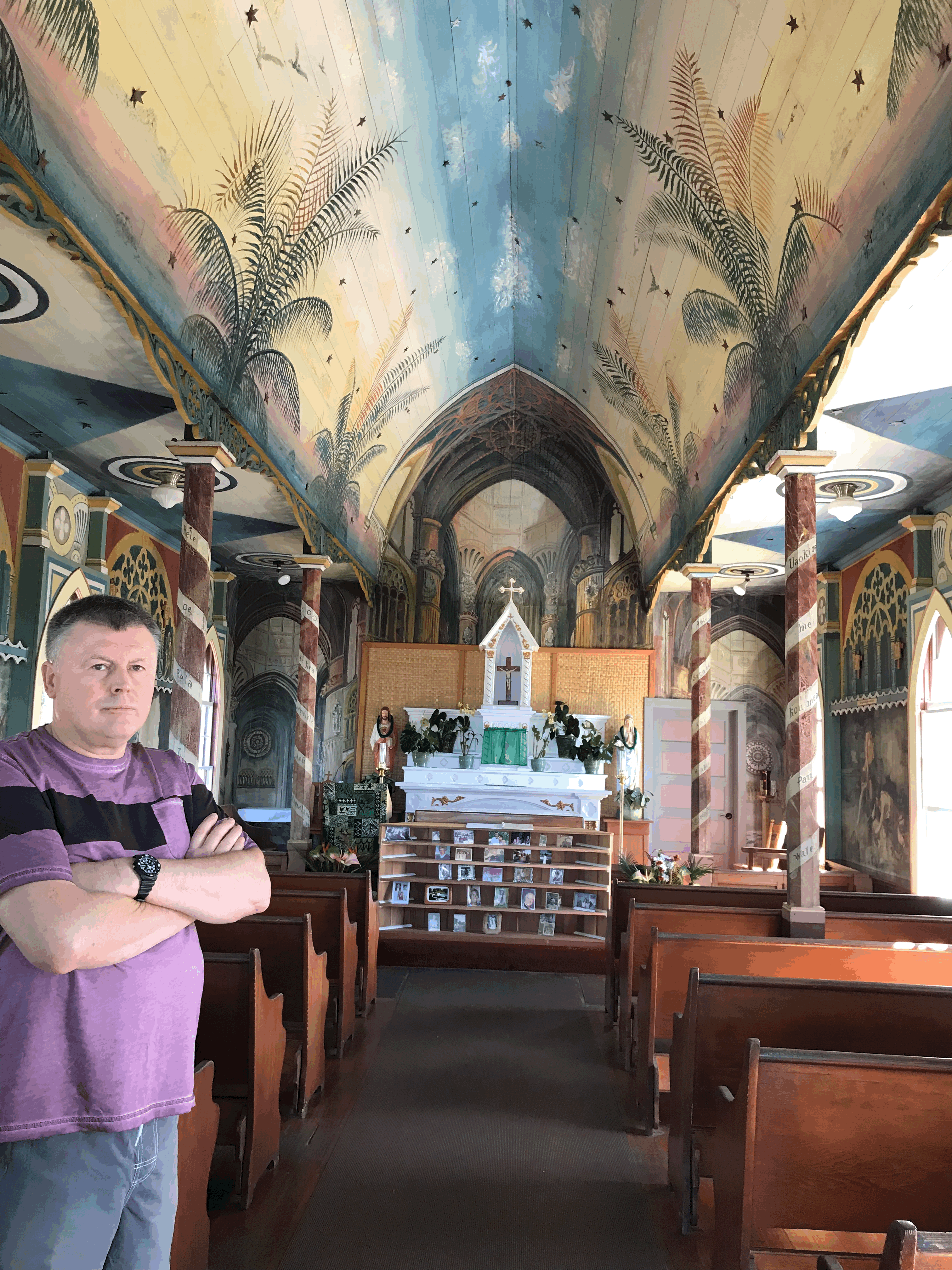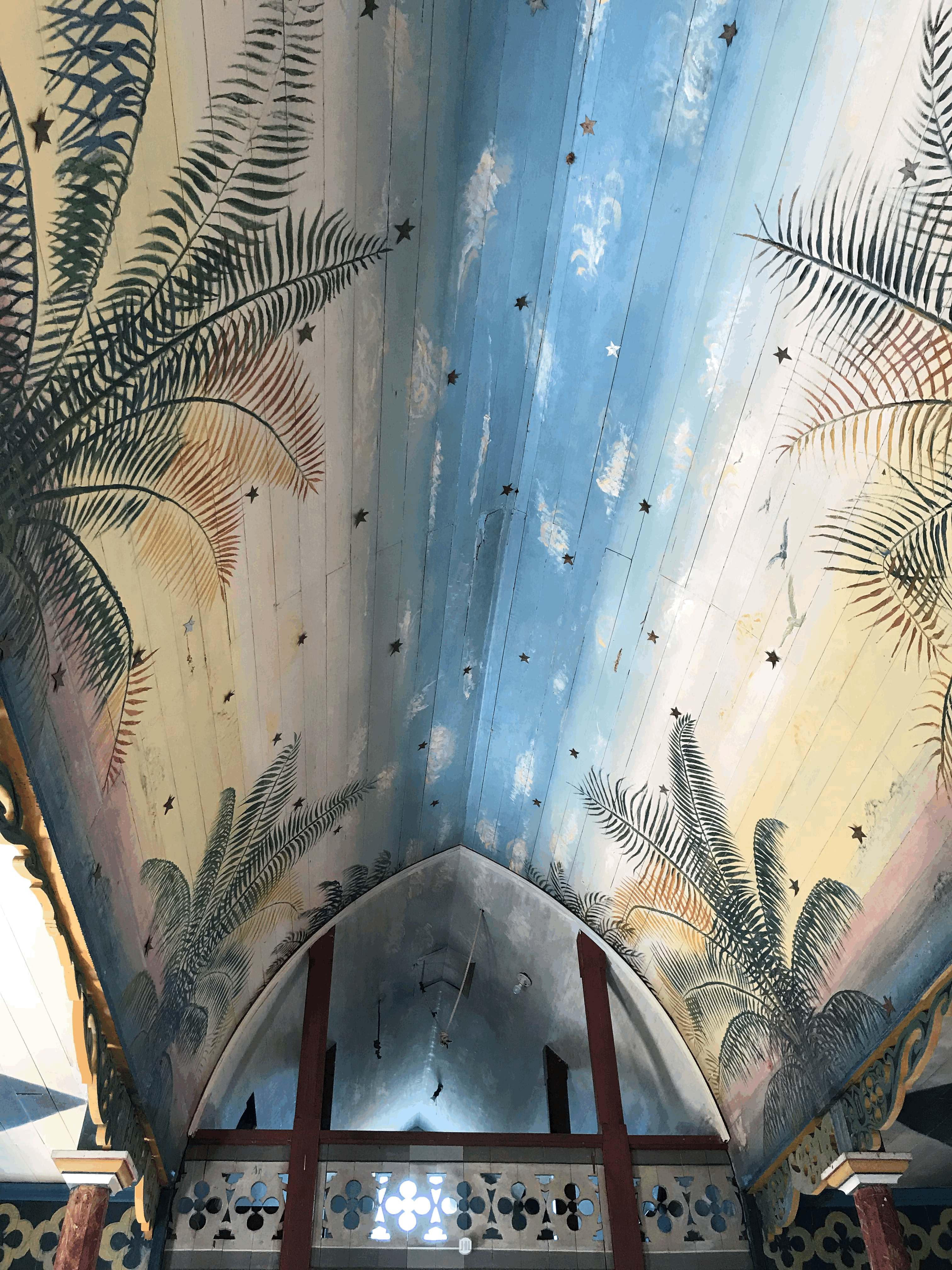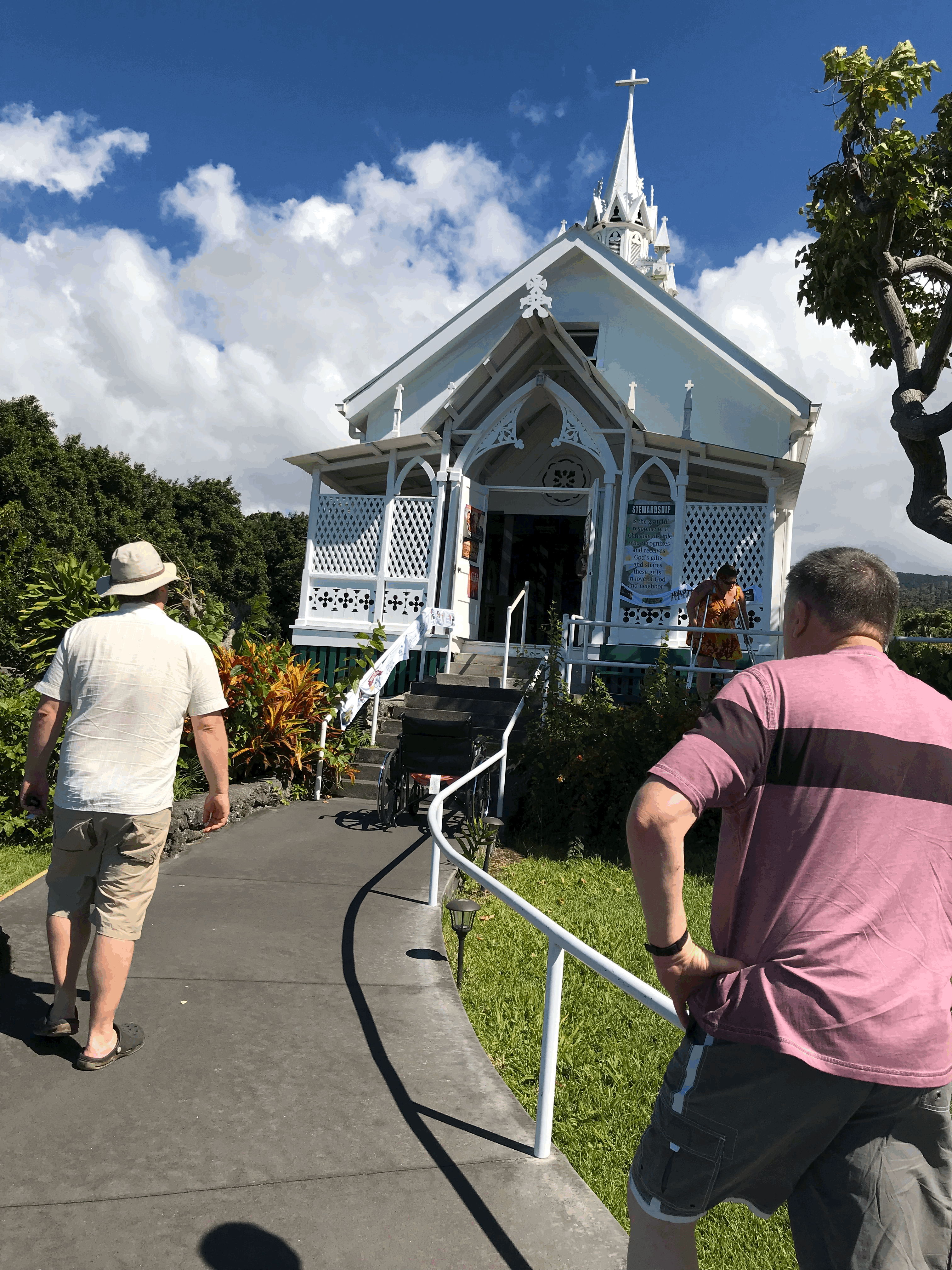 My first morning in Big Island, after many hours of travel via LA, was a trip to Honaunau on the western coast that is an old fishing community and site of archaeological remains. My first stop was to a lovely café with magnificent views, where I had breakfast and of course had to sample some locally produced Kona coffee. While I was having breakfast, a beautiful gecko suddenly appeared on the windowsill of the open window, and it wasn’t nervous of people at all. After breakfast, I travelled around the coast and stopped off by the sea before embarking on a trip to the amazing St Benedict’s church. This church was truly beautiful and so intricately painted. You can walk around and through the church and take as many photos as you like. As well as being a historical site, the church is still a parish that looks after the local community and even provides medical services.