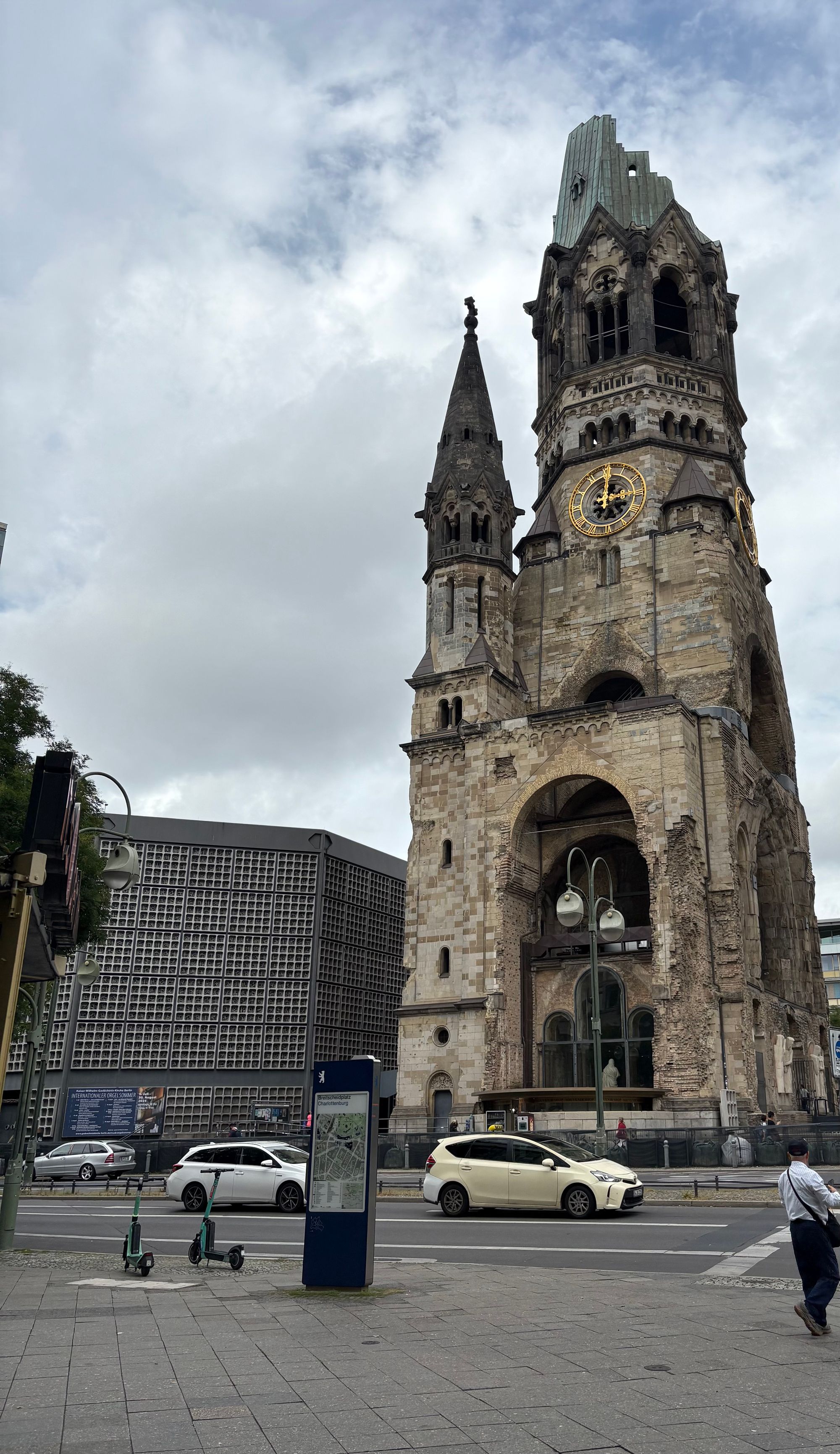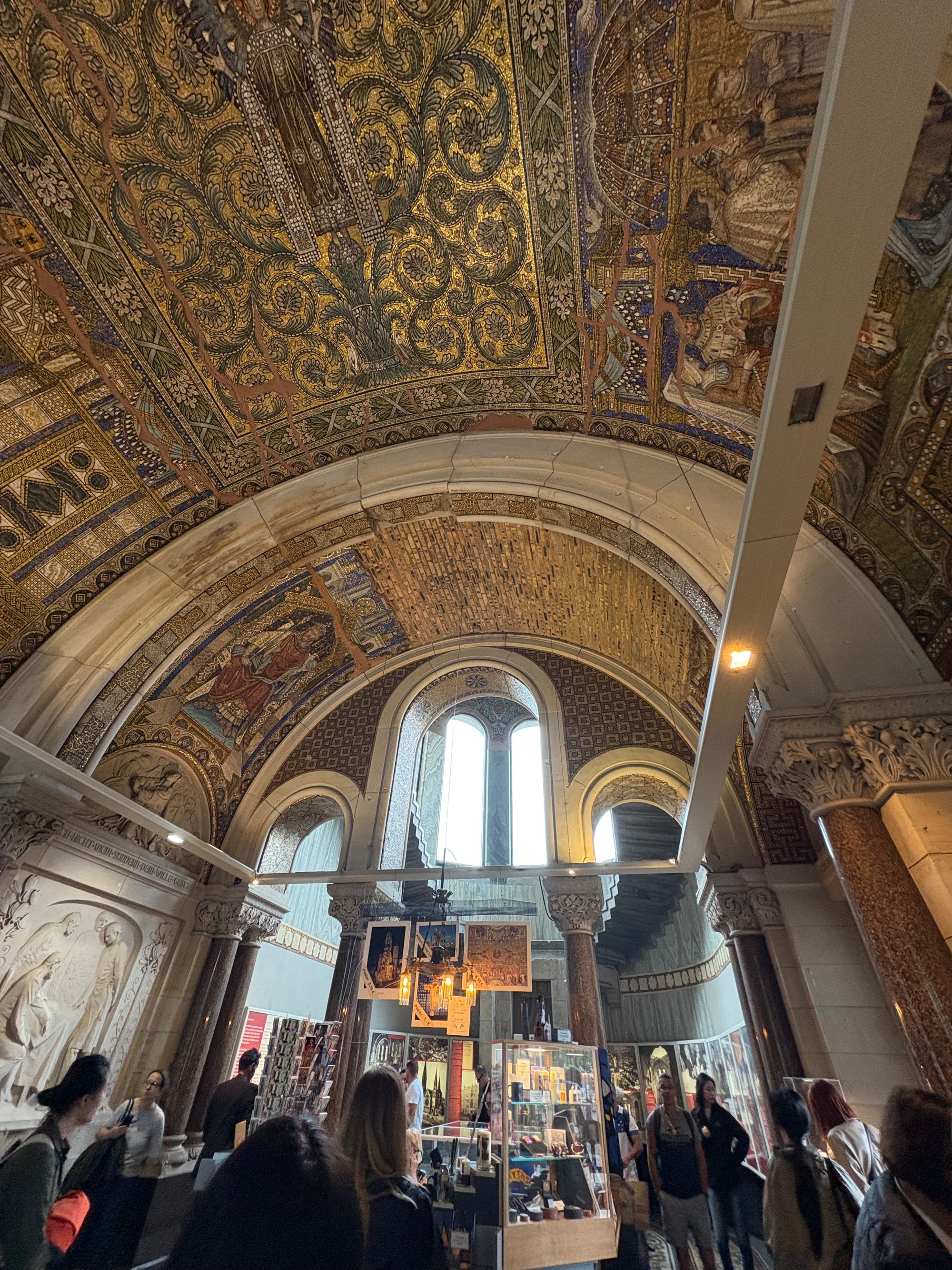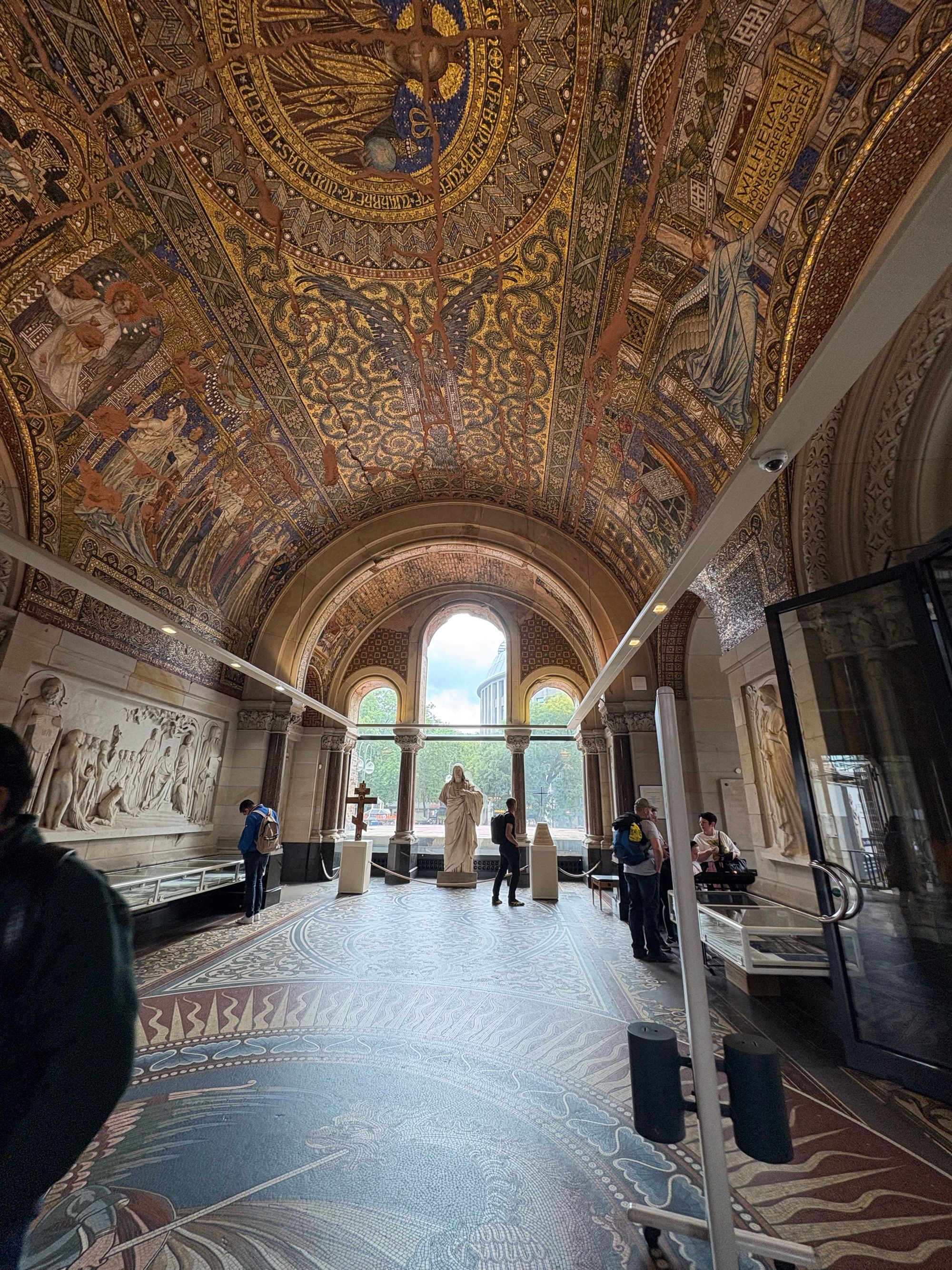 Walking on from the sculpture, you soon reach the beautiful Kaiser Wilhelm Memorial church. This church is deceptive as, although the outside boasts some lovely architecture, the inside is incredible with its beautifully decorated walls, floor, and ceiling with fabulous colourful paintings that are inlaid with gold. The church was damaged during WWII and is now a memorial against war and destruction. It is free to enter the church but there is a little donation box at the front, and all donations are gratefully received.