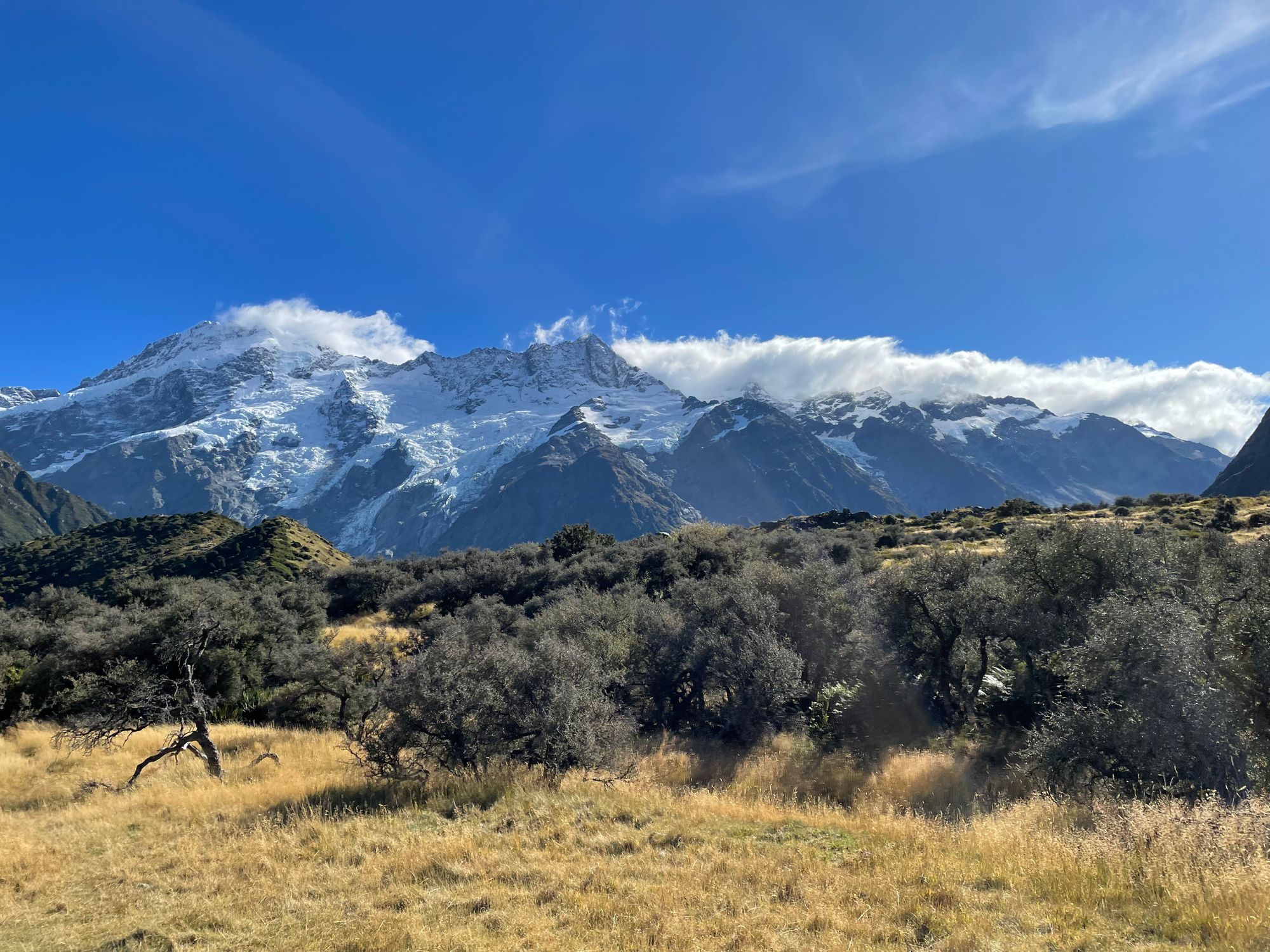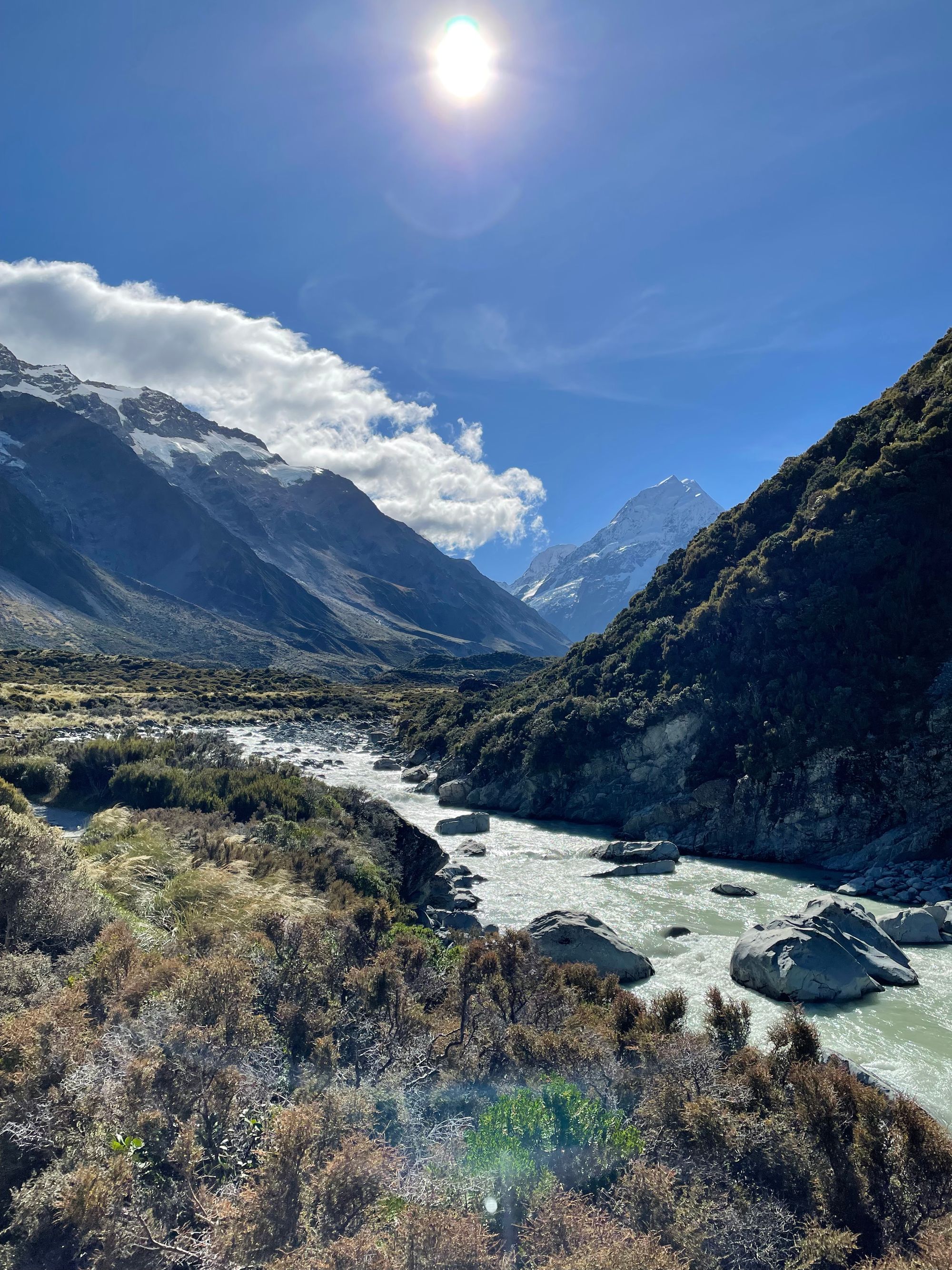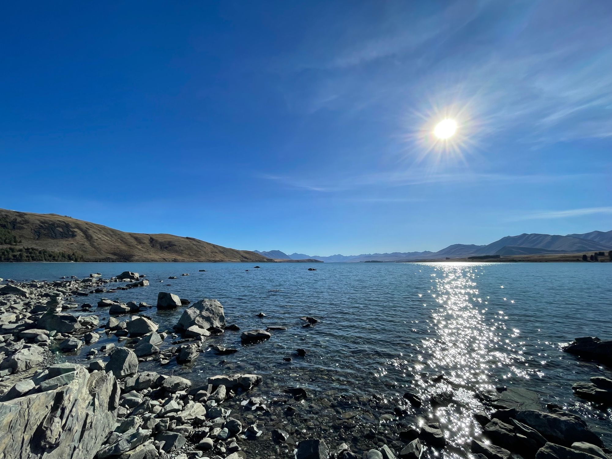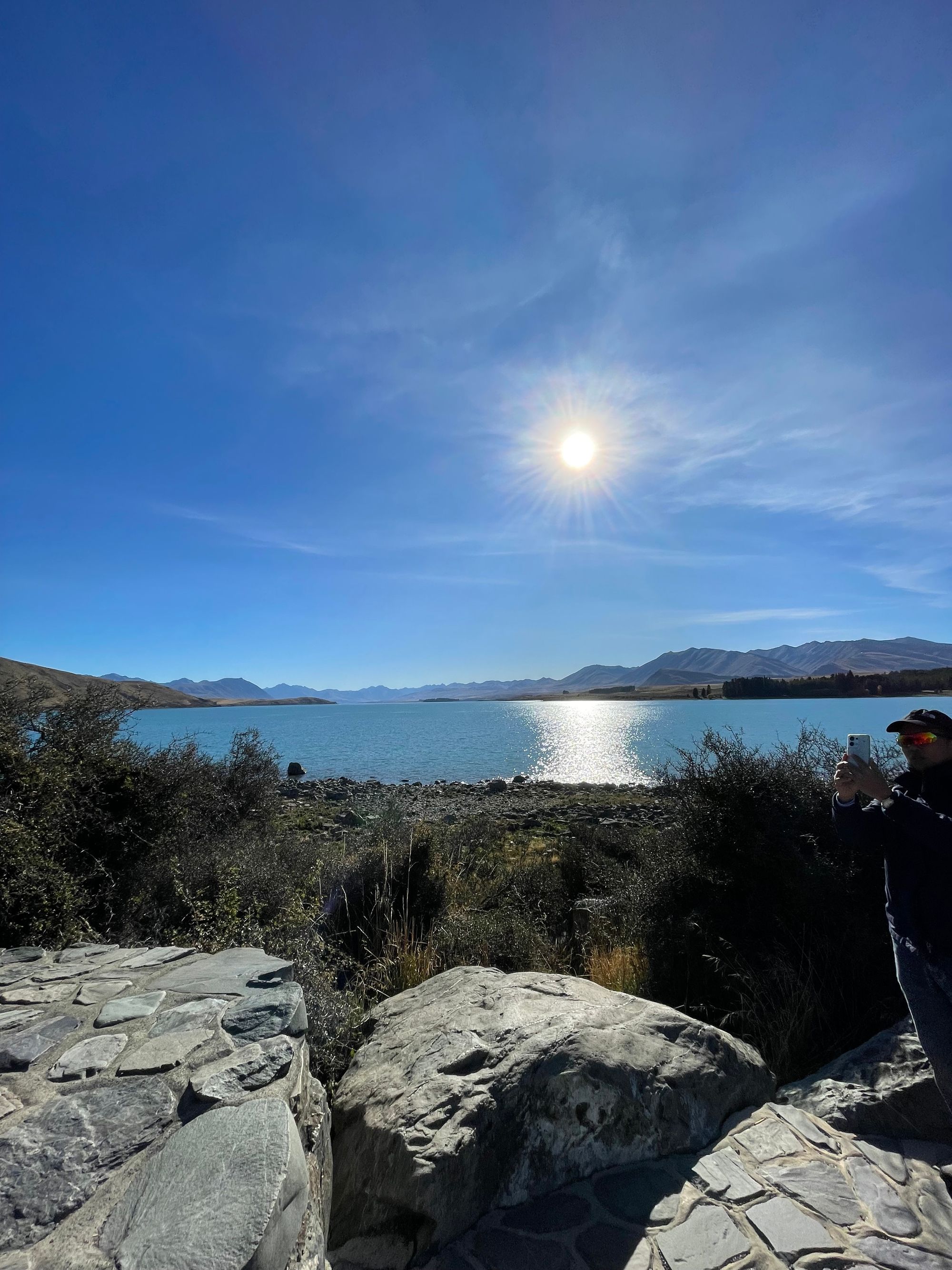The first stop on my trip was Lake Tekapo, which was beautiful and especially with the sun shining on it – the reflections from the sun almost looked like torches flashing on and off on the surface of the water. The lake is a crystal-clear highland lake and township and is located in the Mackenzie basin. You can also view the old Church of the Good Shepherd here which was built by the Mackenzie pioneers to provide a place of gathering and worship. We got quite a nice length of time here before we had to continue on our way to Mount Cook.