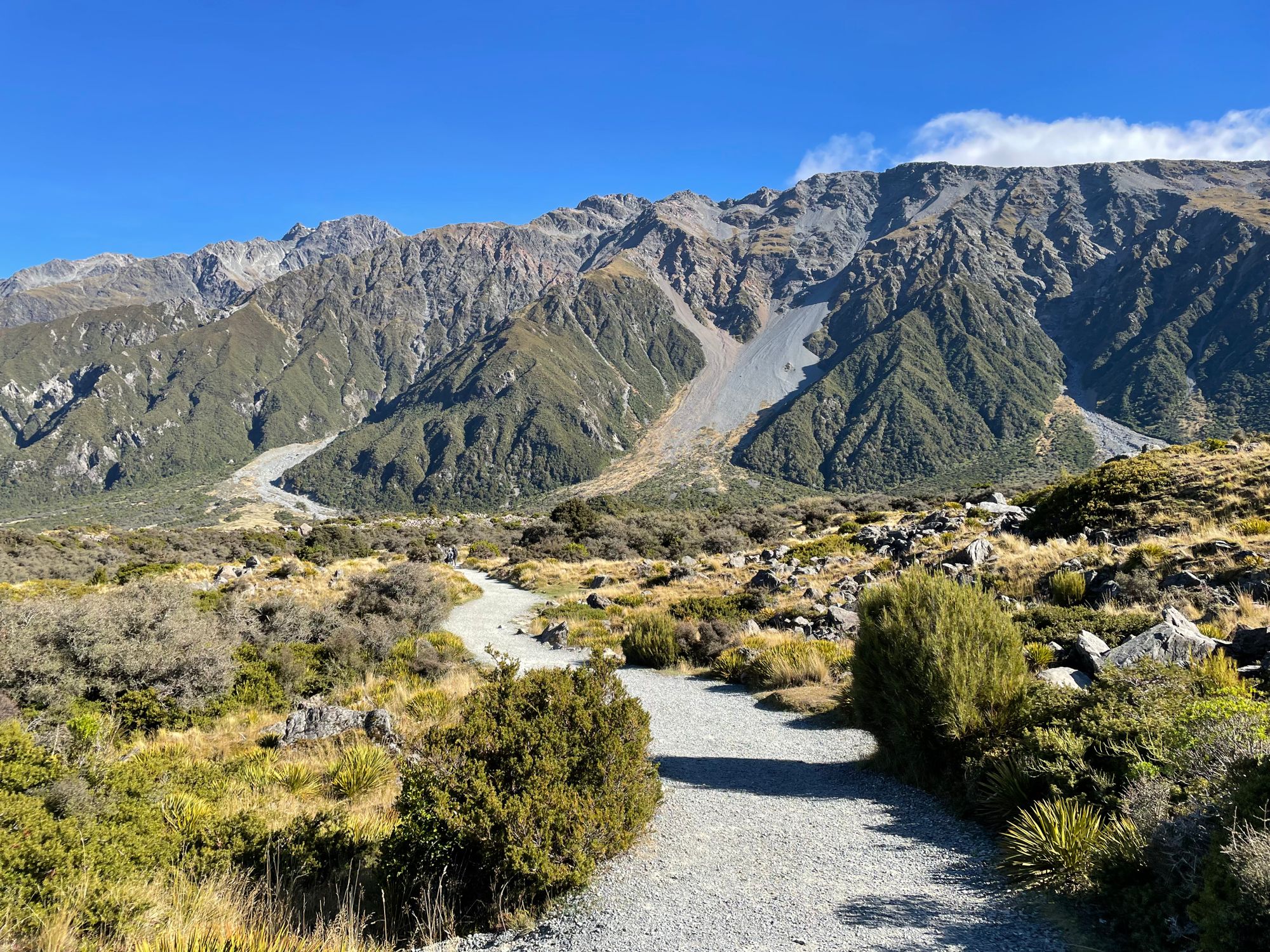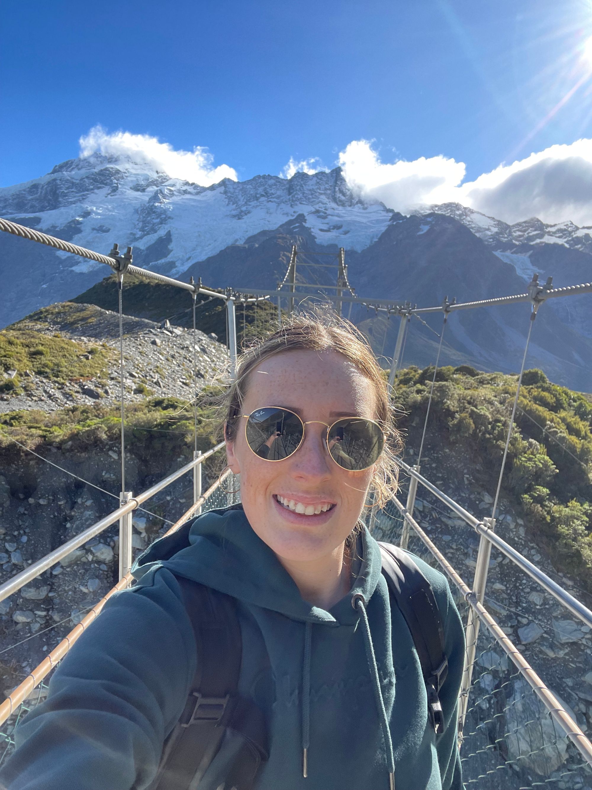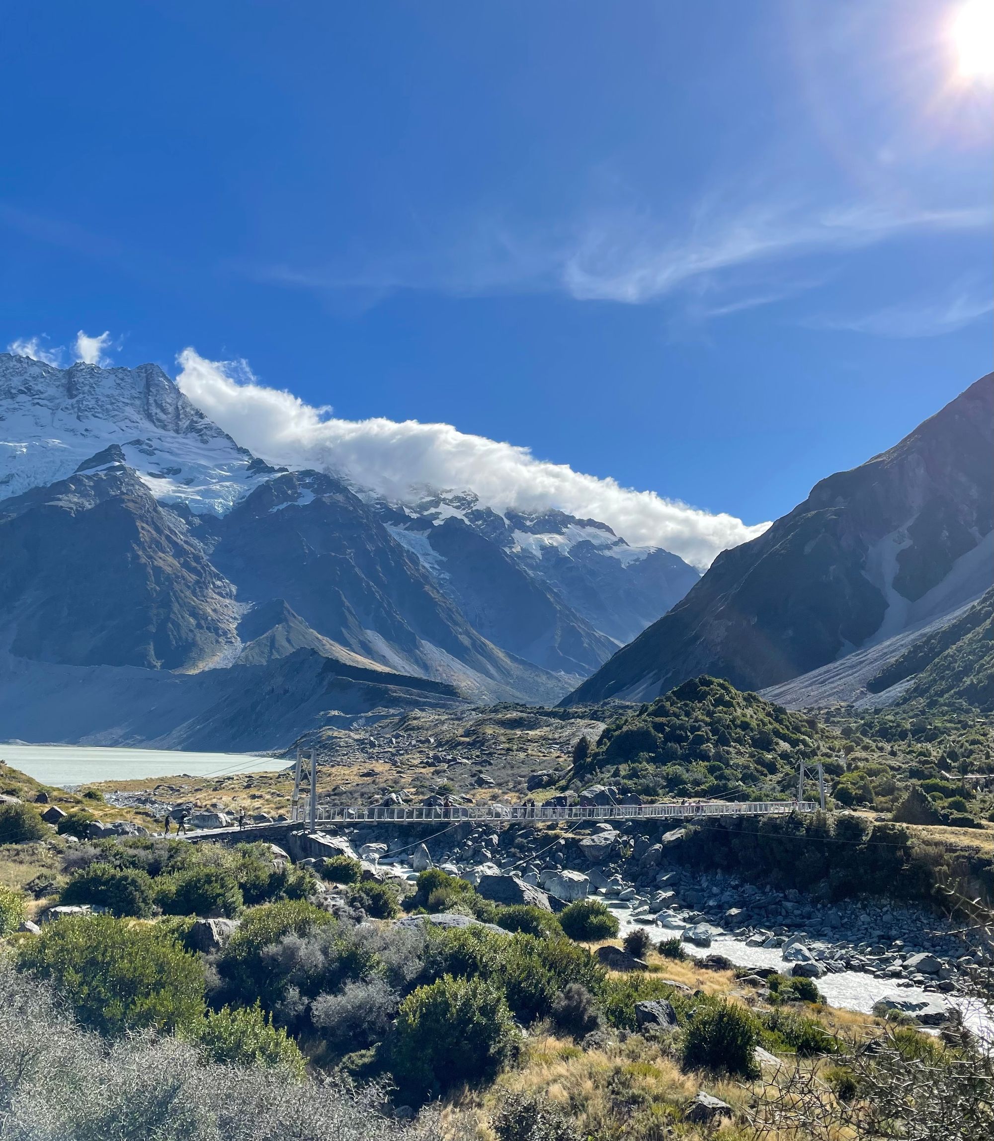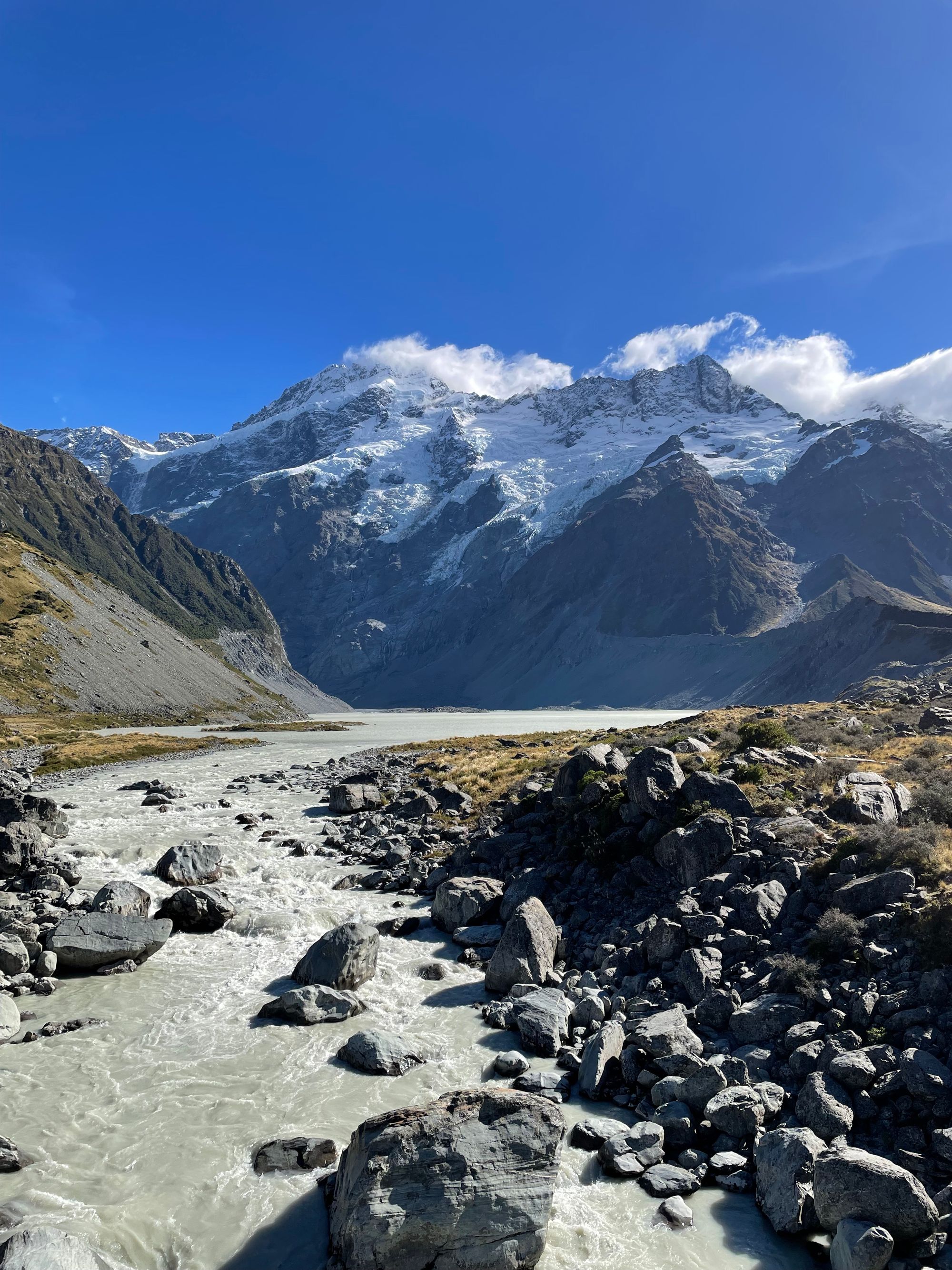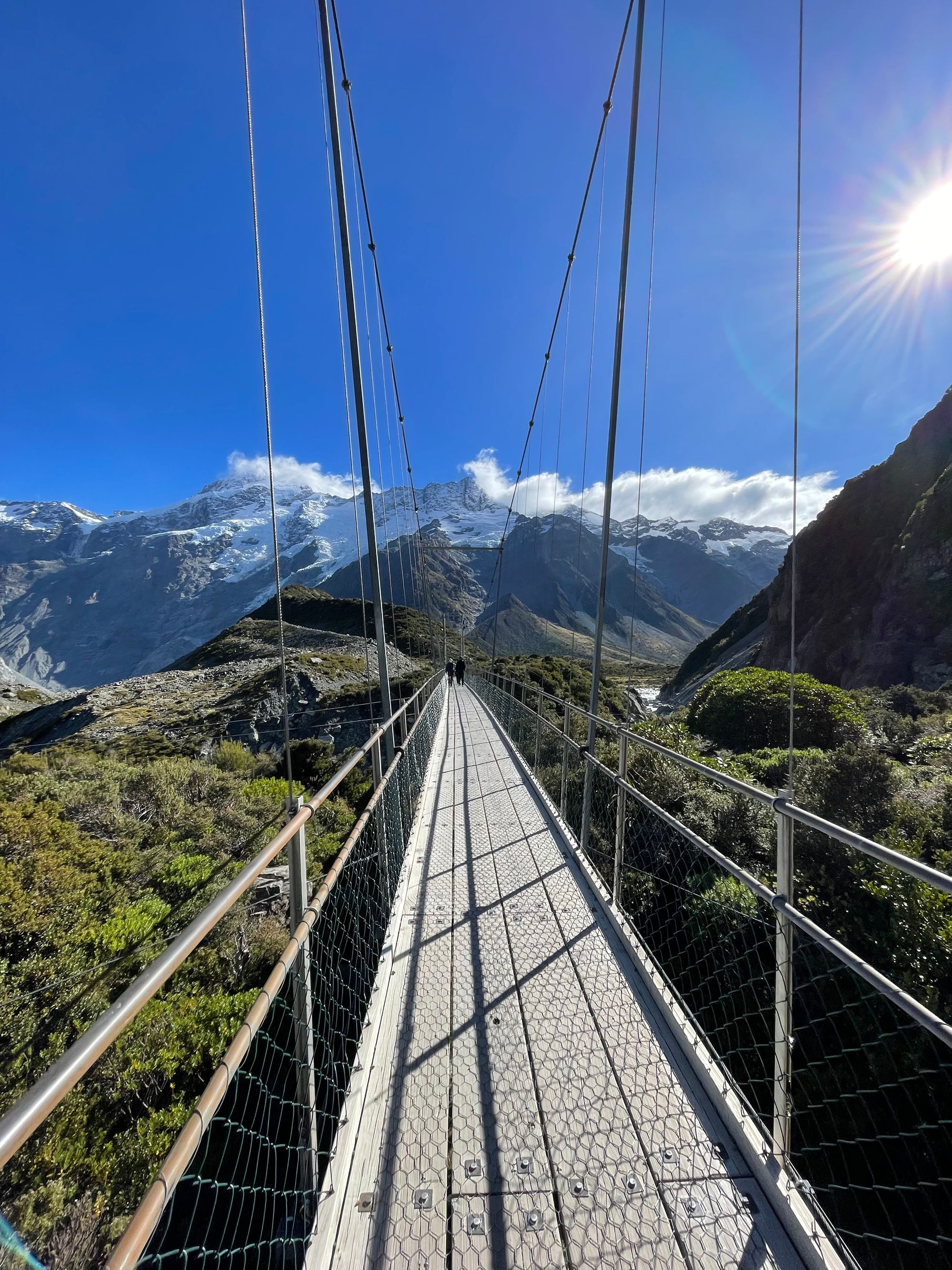 Mount Cook (Aoraki) dominates the Mount Cook National Park and is the highest mountain with the longest glaziers in New Zealand. It stands at around 3,724 m and is said to have assisted Sir Edmund Hillary in his plight to conquer Everest. The mountain range in this area is absolutely stunning – words can’t really describe its beauty, so I hope that some of my photos will. The perfect blue sky contrasted with the snow-capped mountain range, and when you arrive at the parking area for the park there are several different walks you can take that will enable you to get a full appreciation of the area. I chose to do the longer walk which would hopefully take me between 2 and 2.5 hours and went over several suspension brides and out to the glazier on the far side. This was a beautiful walk, and it really wouldn’t have been the same on a bad day. I think it actually took me nearer to the 2.5 hours and I had to turn back slightly sooner than planned due to time constraints – probably because I was taking too many photos and videos! Still, I may not get there again, so I felt that I needed to get as many photos as I could so that I could remember this amazing experience forever.