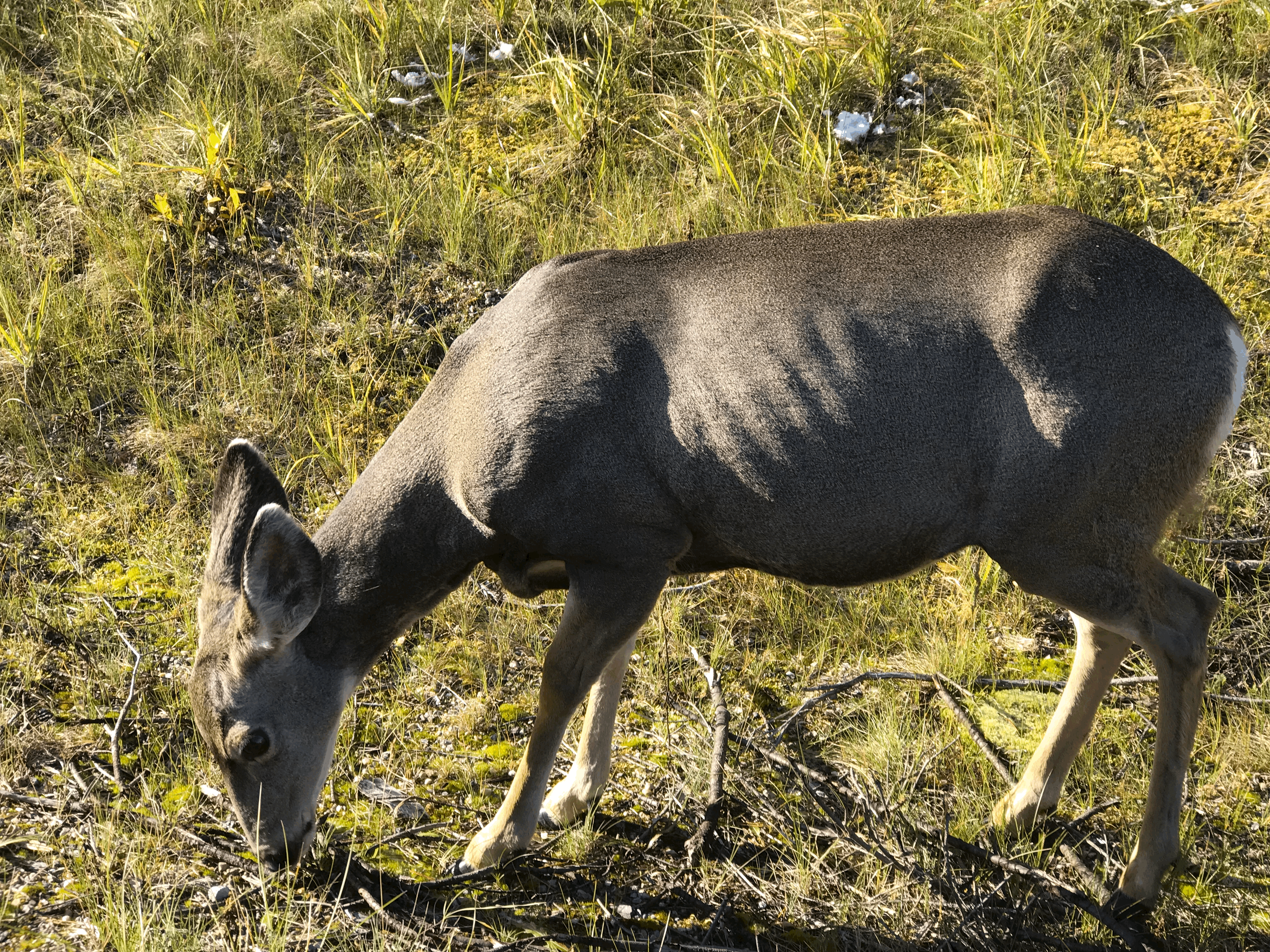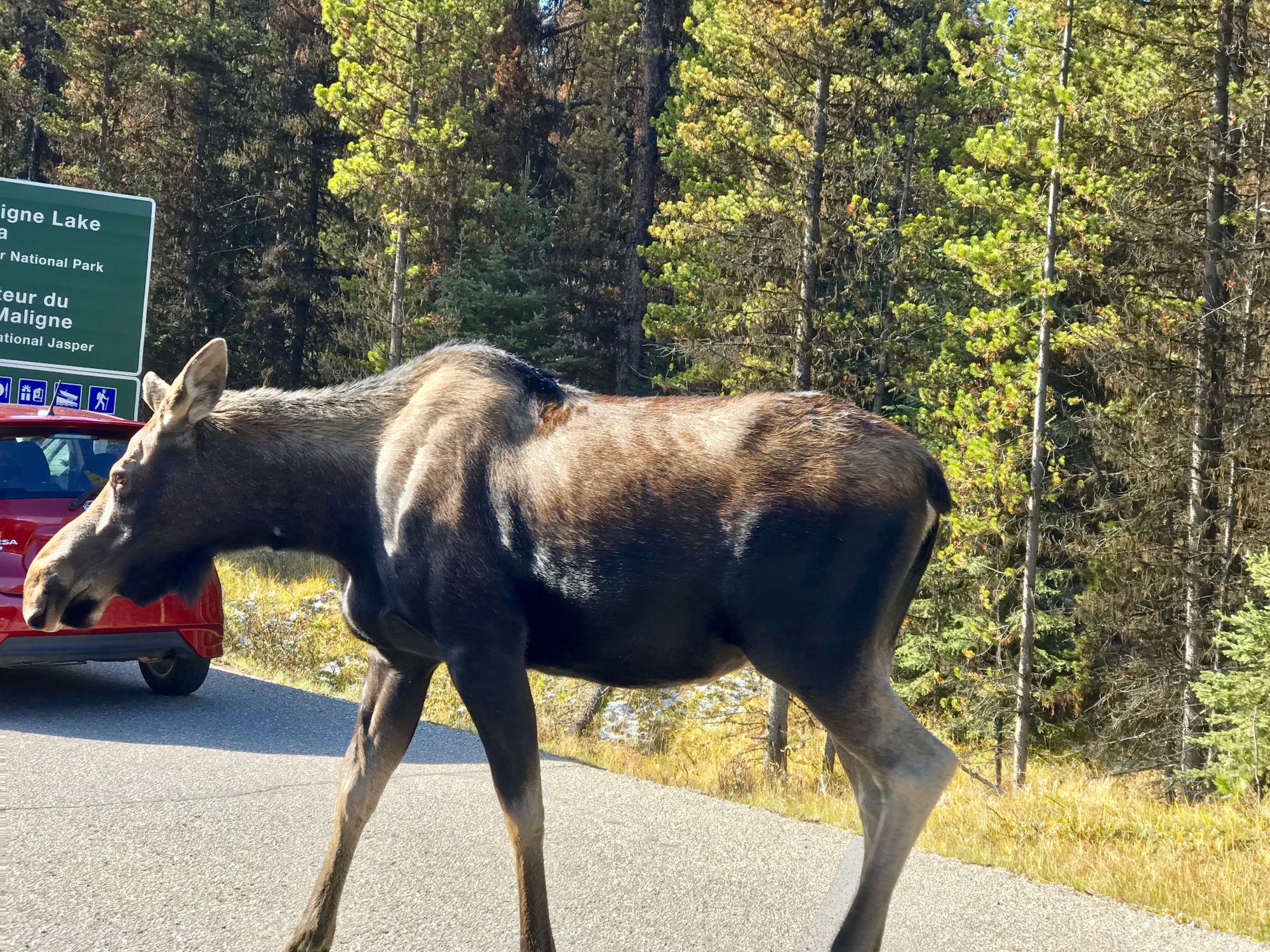 It was soon time to set off to Jasper, and this route held some hope of spotting a bit of Canadian wildlife. So, we were quite excited and hoped that our patience would at last be rewarded. We set off early in the morning, as we had been told that this was the best time to spot wildlife. It wasn’t too long into our journey before we spotted some vehicles parked up on the right of us with interested people looking out into the wilderness. We pulled up behind them and were soon rewarded with the sighting of a brown grizzly bear in the distance! It wasn’t easy to get good photos from that distance without specialist camera equipment, but we did our best and managed to get a reasonable shot out of all the ones we took. We then set off again and were soon rewarded with a sighting of a young moose that decided to amble across the road – it was turning into a great day!