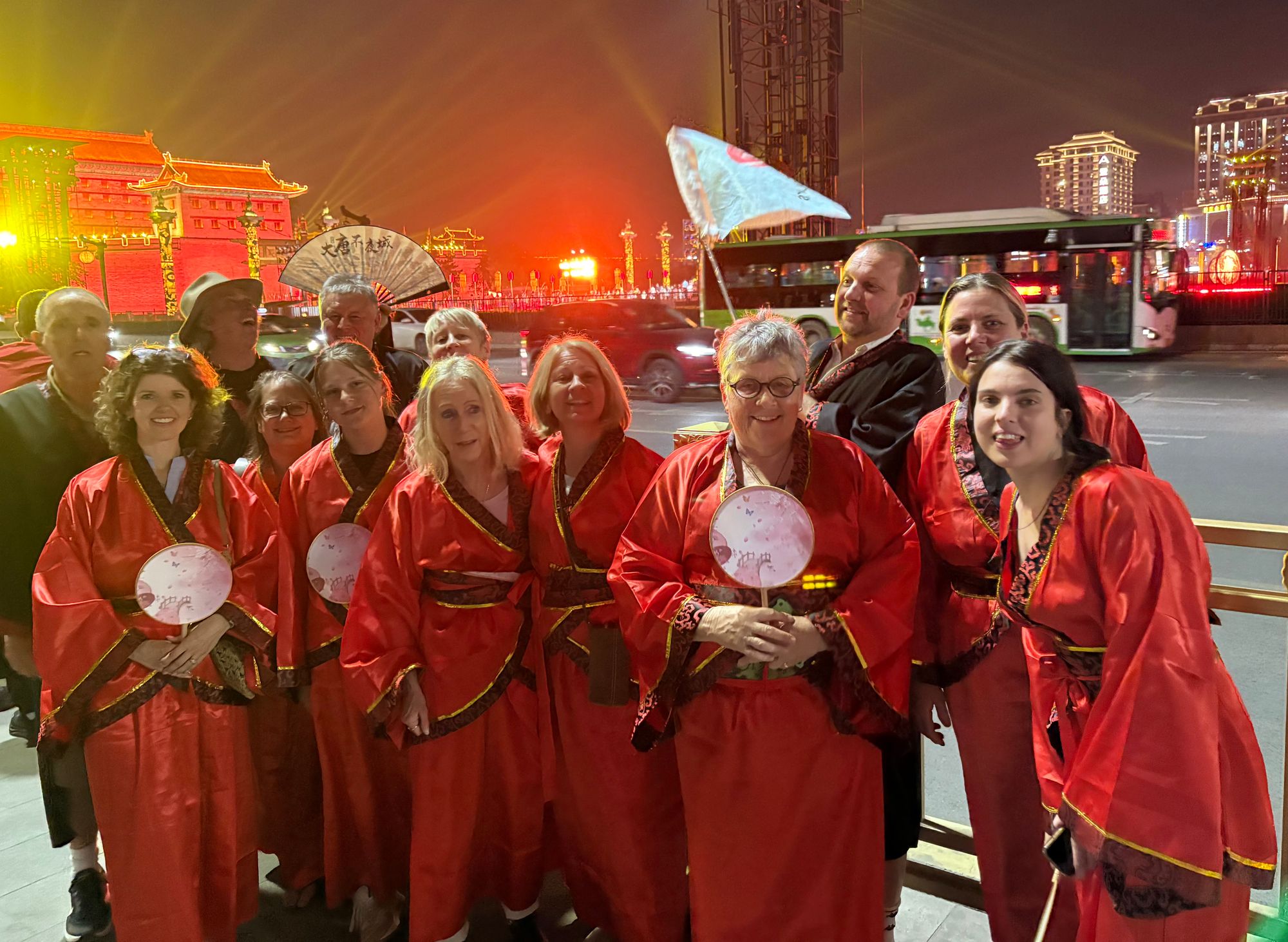 Our evening was finished off by a little excursion into the centre of Xi’an which Alison told us would be a welcomed surprise. She went out to purchase fans and Chinese costumes. She then had us all changing on the coach to transform ourselves into Chinese god and goddesses. There were one or two mumblings in the background about not wanting to dress up, but we all conformed in the end and what a ball we all had!