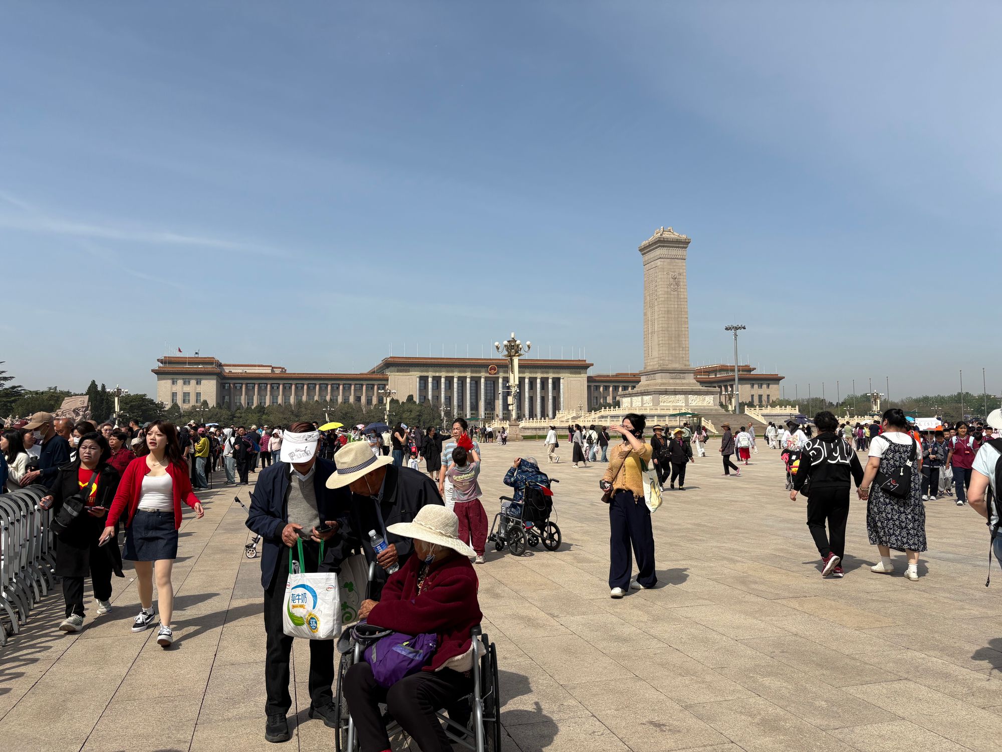 Our first stop was Tiananmen Square, which is the Entrance Gate of the Imperial Palace complex and Imperial City in the centre of Beijing. It was first built in 1420 during the Ming Dynasty, and Tiananmen was the entrance to the emperor’s residence. The square is huge, probably bigger than I had expected. There was a real buzz of excitement around me, as tourists in large numbers kept arriving all the time. Colourful costumes were everywhere, and flags waved madly on sticks to ensure that groups stuck together. The sky was blue, and the heat was already beginning to hot up for the day. Prior to entering the square, which was the case for most of China’s sites, everyone had to go through a security check that included a passport check. Debbie and I had our small insect repellent sprays removed at this point and thrown away, due to the flammable sign, where they joined a box of lighters, small bottles of alcohol and various other flammable liquids that had so far been removed from tourist that day. We had our first group photo taken here which was put in the front of a lovely souvenir book that we could purchase a copy of at the end of the day.